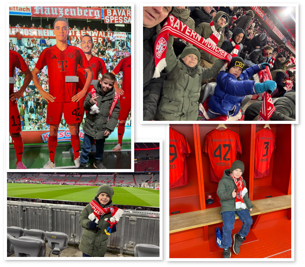 Henri ist ein sehr aufgeweckter und lustiger Junge. Während seiner langen Behandlungszeit musste er ganz schön geduldig sein, was für alle Kinder ja nicht so einfach ist. Henri ist ein riesengroßer Fußballfan, ein noch größerer FC Bayern-Fan und der allergrößte Musiala-Fan!! Daher lag sein Wunsch nahe: Einmal, zusammen mit seinen Eltern und seinem besten Freund Jack, ein FC Bayern-Spiel live in der Arena miterleben zu dürfen. Ein paar Tage vor Weihnachten war es soweit und was war das für ein Spiel!! FC Bayern gegen RB Leipzig! Einfach ein Hammerspiel! Insgesamt konnte er sechs Tore bewundern und bei fünf Toren jubeln, denn natürlich hat seine Mannschaft gewonnen, 5:1. Henris Mutter schrieb uns: „Das Wochenende wird uns immer in Erinnerung bleiben. Kinderaugen so strahlen zu sehen ist einfach wundervoll.“ Am nächsten Tag gab es dann noch eine ausführliche Stadionführung und selbstverständlich konnte sich Henri in der Mannschaftskabine auf Musialas Platz setzen. Ein wunderbares Spiel, ein einmaliges Erlebnis von dem Henri noch sehr lange erzählen und zehren wird.