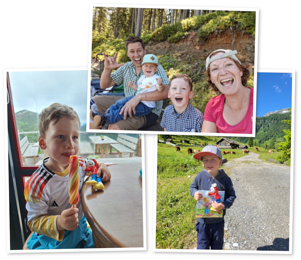 Theos Lieblingsbuch heißt „Conni in den Bergen“, in dem der Satz steht: „…von hier können sie in der Gondel hinunter ins Tal schweben…“. Das stellte er sich einfach fantastisch vor und wünschte sich zusammen mit seiner Familie „ganz viel Gondel fahren“ zu dürfen. Schon der Wunschbrief an uns war eine süße kleine Gondel – wie kreativ!! Mit dem „Millenium-Express“ in Kärnten, mit einer Gesamtlänge von 6km der längsten Gondelbahn Österreichs und zweitlängsten der Alpen, konnte Theo nach Herzenslust fahren so oft er wollte, denn das Gondelfahren war für Übernachtungsgäste der Region in der Gästekarte beinhaltet. Und das hat Theo auch ausgekostet: mindestens dreimal am Tag fuhr er zusammen mit seinen Eltern, seinem kleinen Bruder und unserem Kinderträume-Maskottchen über die Täler und genoss die Aussicht auf das grandiose Bergpanorama. Es wurde nie langweilig, denn man hatte ja einen tollen Weitblick und immer gab es etwas Neues zu entdecken. Auch auf den Wanderungen, vorbei an den vielen Kühen und hinauf auf die Hütten mit dem „Belohnungseis“, war immer etwas los. Zum Glück konnte Theo sich im wunderschönen „Hotel Samerhof“ super erholen und bei leckerem Essen (besonders das Eis!!) wieder neue Kräfte sammeln für die nächste Gondelfahrt.