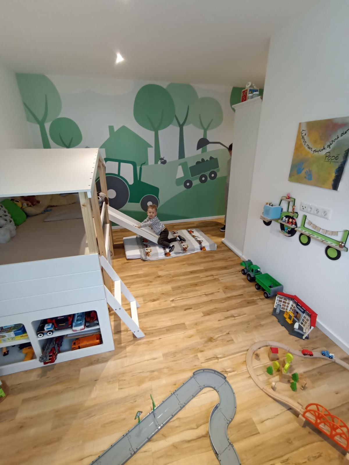 Endlich hat er nun die Therapie überstanden und sein großer Herzenswunsch war es, ein neues Zimmer zu bekommen. Als riesengroßer Traktorfan sollen in seinem „Treckerzimmer“ ein wunderschönes „Hausbett“, in dem sich der kleine Connor einkuscheln und träumen kann, und eine coole „Traktortapete“ sein. Das Zimmer ist wunderschön geworden und seine Mama hat uns gesagt, dass Connor abends, wenn er im Bett liegt und auf diese wunderschöne Tapete schaut, sagt: „Mama, ich schlafe gleich… der Fuchs schläft schon!“.