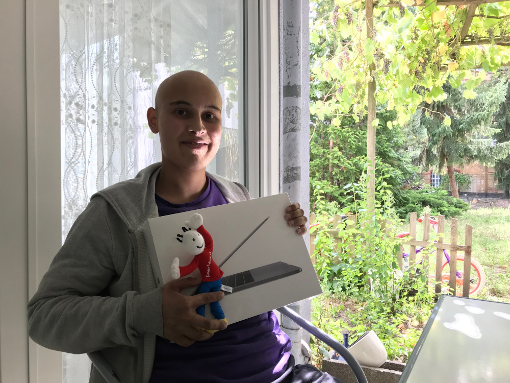 Mustafa (16 Jahre alt) ist ein außerordentlich netter Jugendlicher, der sich leider bereits vor seiner Krebserkrankung auch schon sehr gut mit Krankenhausaufenthalten auskannte, denn er hat seit Geburt einen Herzfehler und musste deswegen schon viele Male operiert werden. Vor ein paar Monaten kam dann noch die Diagnose Krebs dazu, wie schrecklich. Natürlich durfte sich Mustafa von uns etwas wünschen. Er hat gerade trotz Erkrankung die mittlere Reife geschafft und sein großes Ziel ist, das Abitur zu machen und studieren zu können. Das finden wir natürlich ganz toll und daher wünschte er sich von uns einen Laptop, mit dem er sich perfekt für die Schule vorbereiten kann (und bestimmt auch Filme gucken und Spiele spielen kann ;-). Seinen Wunsch haben wir ihm vor kurzem erfüllt und auf dem Foto sehen Sie einen überglücklichen Mustafa. Mustafa hat noch drei Brüder, da ist also immer ordentlich was los und Fußball ist natürlich ein großes Thema! Bei der Wunscherfüllung waren er und seine Mutter zu Hause, und mich hat es sehr gefreut, dass Mustafa und seine Mutter eine so positive und zuversichtliche Einstellung haben. Mustafa ist sehr ehrgeizig und wird mit Sicherheit seinen Weg machen. Ich habe ihn gefragt, was er studieren möchte? Er möchte gerne Sozialarbeit oder Psychologie studieren, wie schön. In diesen Berufen kann ich ihn mir sehr gut vorstellen :-).